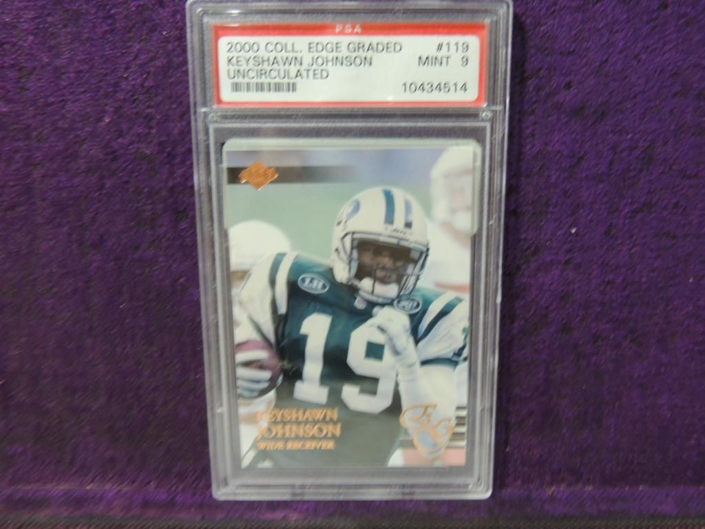 2000 COLL EDGE GRADED. KEYSHAWN JOHNSON UNCIRCULATED #119 GRADED MINT 9 BY PROFESSIONAL AUTHENICATORS. FOOTBALL TRADING CARD. AS SHOWN. SEE PHOTO FOR MORE DETAILS.