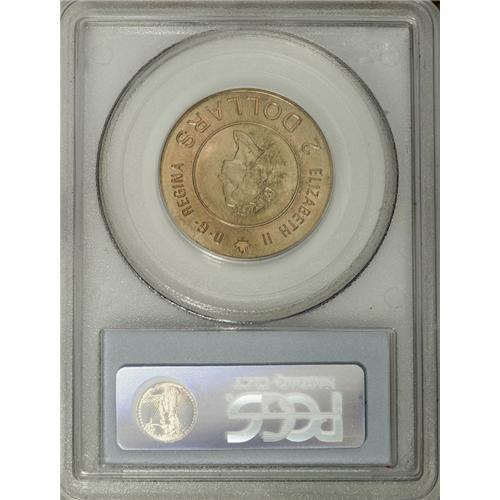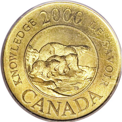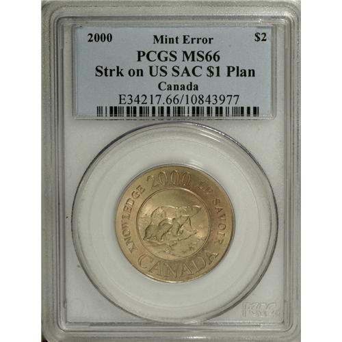 <B>2000 Canada 2 Dollar--Mint Error--Struck on a U.S. Sacagawea Dollar Planchet. MS66 PCGS.</B></I> This is a 2000-dated, normally bimetallic Canada Polar Bear two dollar, or "toonie," struck on a U.S. Sacagawea golden dollar planchet. The Royal Canadian Mint upset the rims on some of the 2000 Sacagawea planchets, due to the large number of first-year Sacagaweas struck--more than 1.25 <I>billion</B></I> pieces between Philadelphia and Denver. In our Signature World Coin Auction 419 we featured a 2000 Canadian half dollar (lot 50778) struck on a Sacagawea planchet. This coin is the sibling of that lot, also dated 2000, and undoubtedly caused by a similar mixup at the RCM. That coin and the present piece are both extremely rare, and are <I>the only known U.S.-Canadian dual-nation coins struck on Sacagawea planchets.</B></I> The inner and outer rings for the (would-be) bimetallic coin are crisp and clear, as are all design details. A spectacular error, perhaps a perfect gift for our dual-national friends!<BR><BR><b>Shipping:</b> Coins & Currency (<a target="_blank" href="http://www.heritageauctions.com/common/shipping.php">view shipping information</a>)