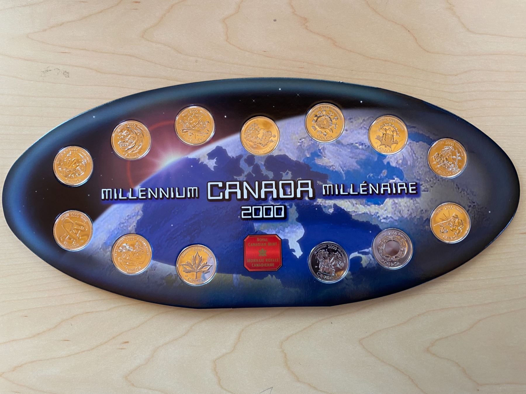 2000 Canada 25 cents. Complete set of 12 2000 Millennium Canada 25 cents plus Commemorative Medallion inserted into an easel featuring an aerial photograph of Canada as issued by the Royal Canadian Mint. All Brilliant Uncirculated.