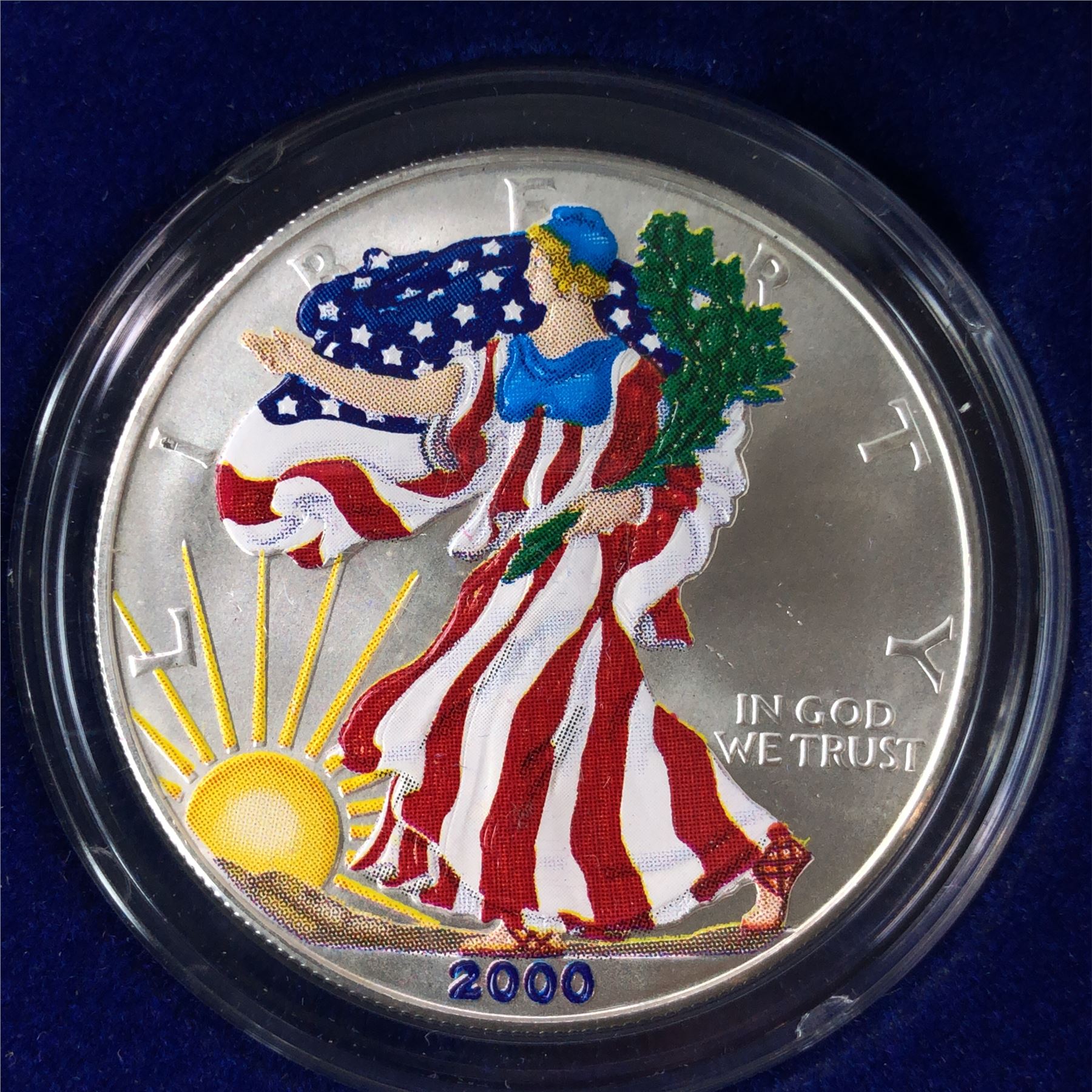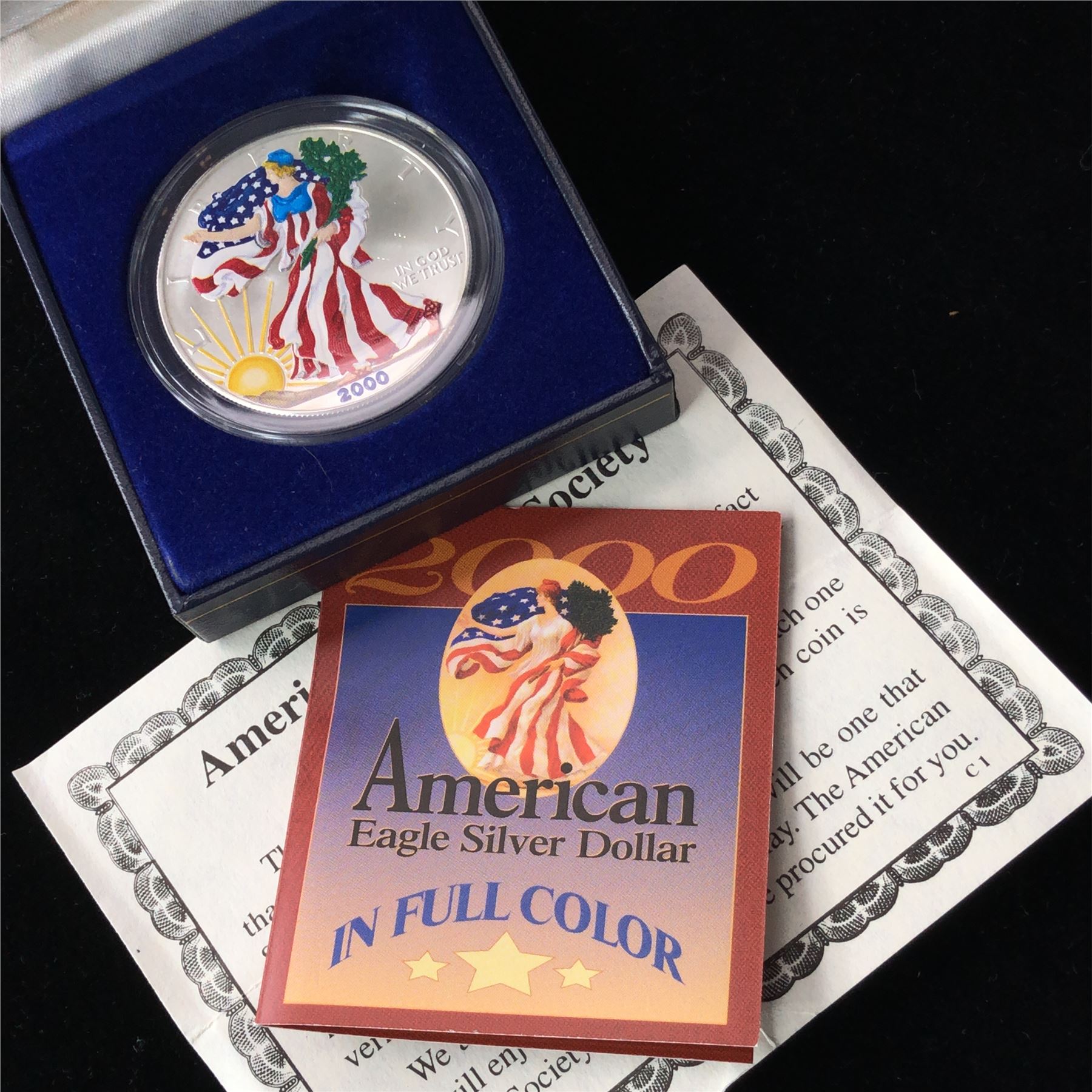 A 2000 Colorized Silver American Eagle Dollar in the Original Issue Box with Certificate Of Authenticity. Its getting harder to find these wonderful colorized Silver Eagles as people hardly ever part with them. Very cool 1oz coin with full COA and Packaging!