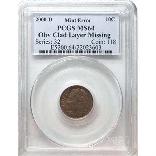 <B>2000-D 10C Roosevelt Dime--Obverse Clad Layer Missing--MS64 PCGS.</B></I> <BR><BR><B>Coin Engraver:</B> John R. Sinnock<BR><BR><b>Shipping:</b> Coins & Currency (<a target="_blank" href="http://www.heritageauctions.com/common/shipping.php">view shipping information</a>)