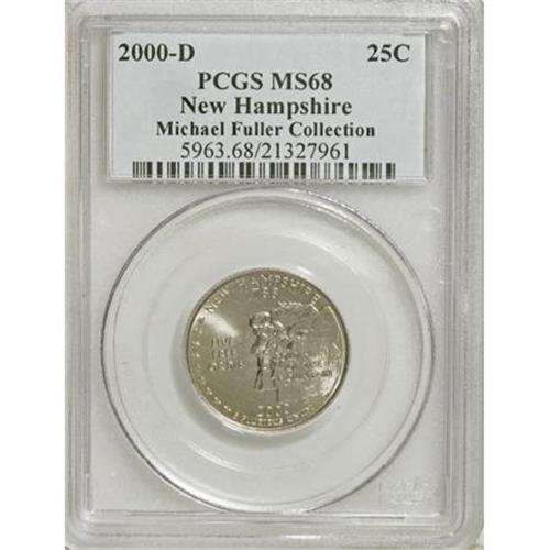 <B>2000-D 25C New Hampshire MS68 PCGS.</B></I> Michael Fuller Collection. PCGS Population (28/0). NGC Census: (0/0). Numismedia Wsl. Price for NGC/PCGS coin in MS68: $650. (#5963)<BR><BR><b>Shipping:</b> Coins & Currency (<a target="_blank" href="http://www.heritageauctions.com/common/shipping.php">view shipping information</a>)