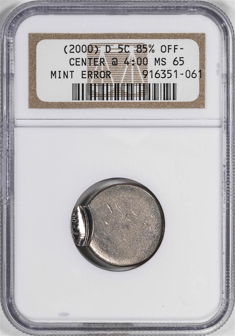 One 2000-D Jefferson Nickel Coin Mint ERROR 85% Struck Off Center @ 4:00 NGC MS65. NGC Certified.