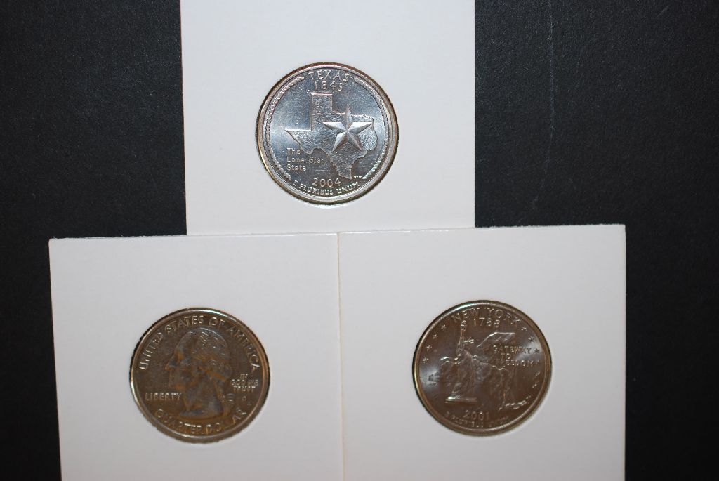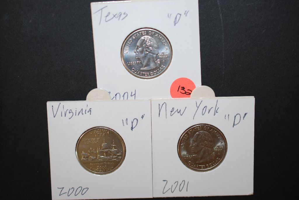 2000-D US Virginia State Quarter, 2001-D US New York State Quarter & 2004-D US Texas State Quarter; Lot of 3; EST. $2-4