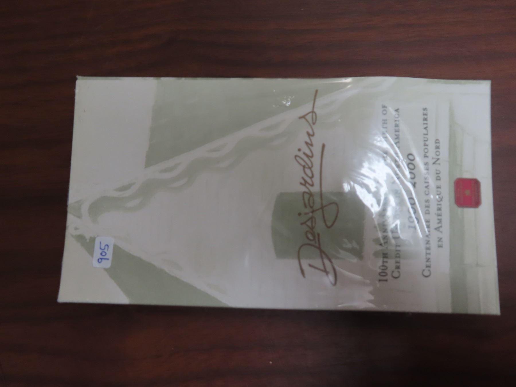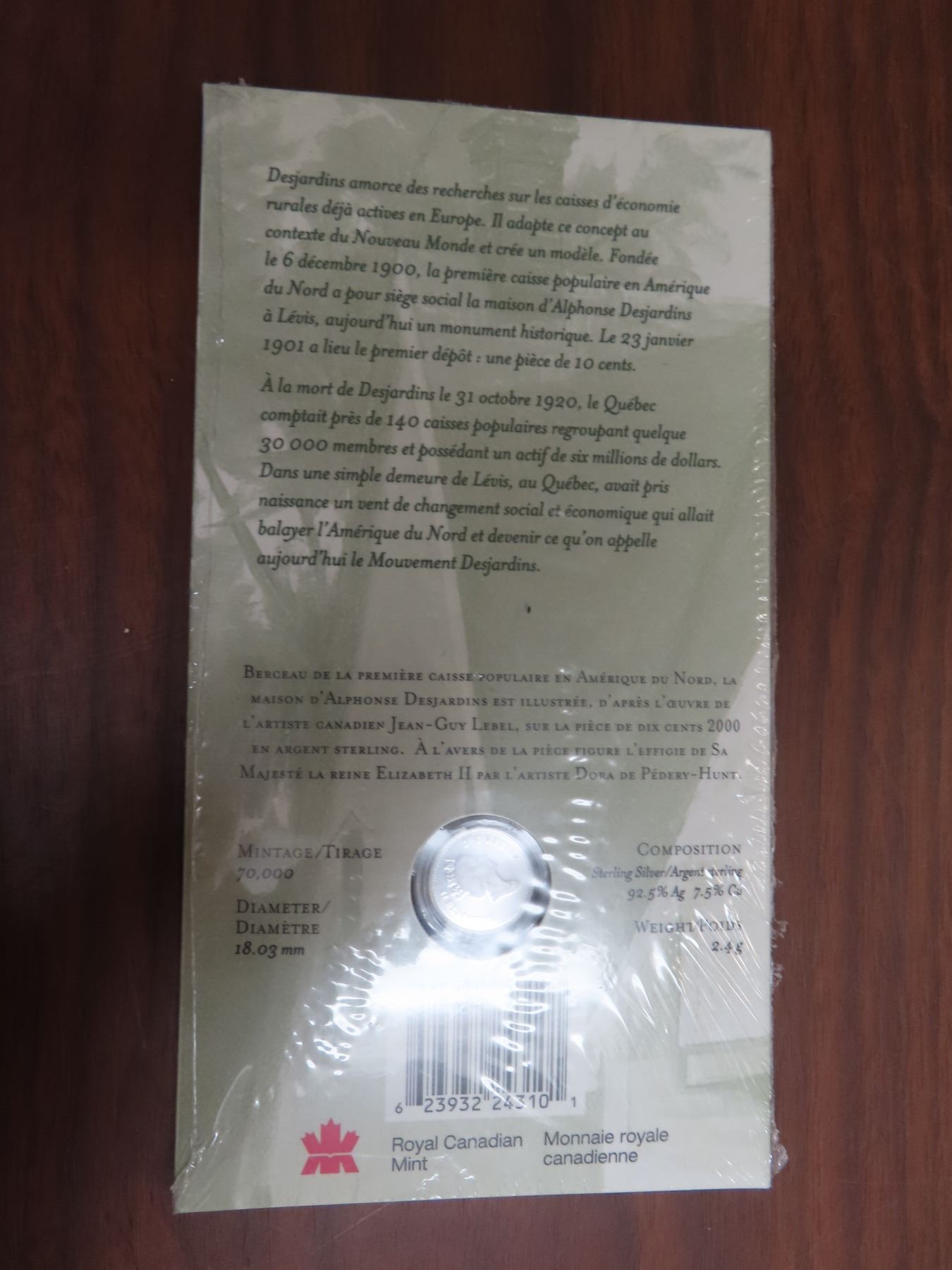 2000 Desjardins Silver 10 Cents. Commemorates the 100th Anniversary of the first Credit Union in North America. Sterling Silver. Proof with Ultra Heavy Cameo. Housed in its unopened Royal Canadian Mint folder of issue.