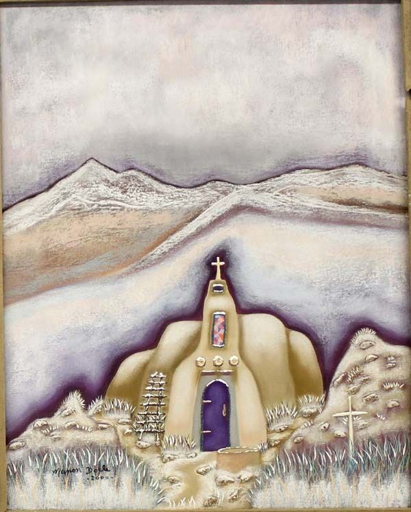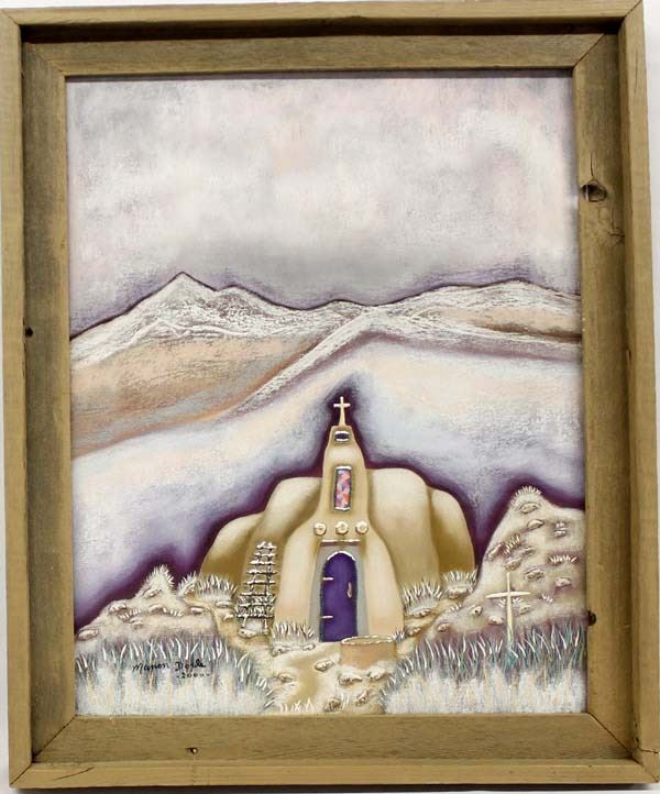 2000 Framed Original Painting ''New Mexico Winter Spirit'' by Manon Doyle, visual measures 15.5'' x 19.5'', signed, this unique painting also features 3 dimensional elements such as the ladder, stones, and viga poles on the church, nice wood frame and under glass