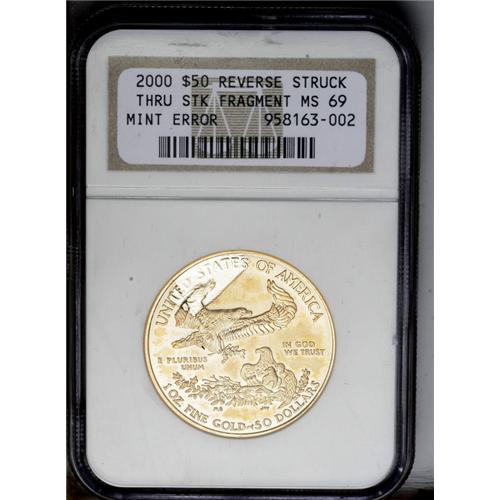 <B>2000<G$50> One-Ounce Gold Eagle--Reverse Struck Through Struck Fragment--MS69 NGC.</B></I> A relatively deep triangular strike-through affects 7% of the reverse, between 10:30 and 12 o'clock. This lustrous and immaculate one-ounce gold coin displays rich honey-gold toning across the fields.