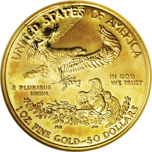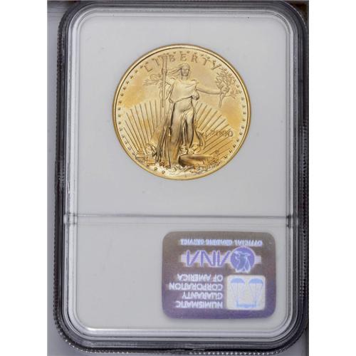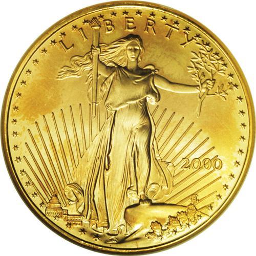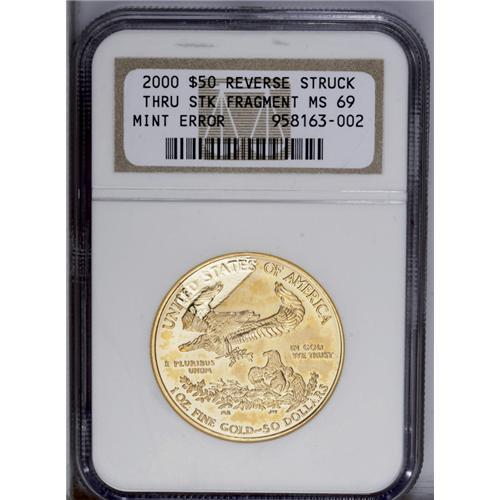 <B>2000<G$50> One-Ounce Gold Eagle--Reverse Struck Through Struck Fragment--MS69 NGC.</B></I> One of several opportunities for the collector of error coins to acquire an example in gold. This piece shows a relatively deep triangular strike-through affects 7% of the reverse, between 10:30 and 12 o'clock. This lustrous and immaculate one-ounce gold coin displays rich honey-gold toning across the fields.<BR><I>From The Henderson Collection of U.S. Gold Errors.</B></I>