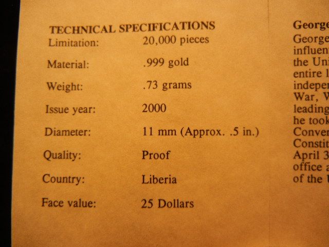 2000 George Washington $25 Miniature Proof, .999 Fine Gold, 73g