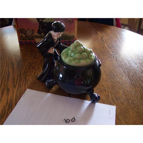 Another darling cookie jar from my collection.This is a 2000 Harry Potter Cj.As you can see in the picture his glasses are off.My great nephew decided one day to remove his glasses.They were just spot glued on so luckily they did not break.I will leave them off for shipping and the lucky buyer can spot glue them on.Comes with original box,that has been taped on one side.Measures 8 1/2" tall to the top of his head.Made by Enesco with the Trademarks of Warner Bros. Numbered on base.