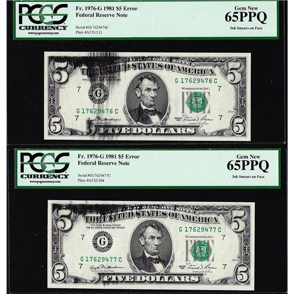 (2) Consecutive 1981 $5 Federal Reserve Ink Smears Error Notes PCGS Gem New 65PPQ