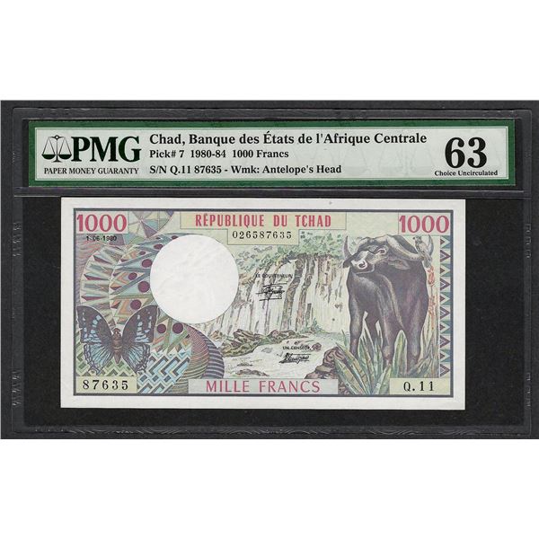 1980-84 Banque Etats Chad Africa 1000 Francs Note Pick# 7 PMG Choice Uncirculated 6351 - 1980-84 Banque Etats Chad Africa 1000 Francs Note Pick# 7 PMG Choice Uncirculated 63