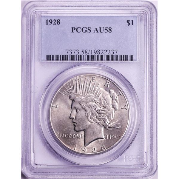 One 1928 $1 Peace Silver Dollar Coin PCGS AU58. PCGS Graded.