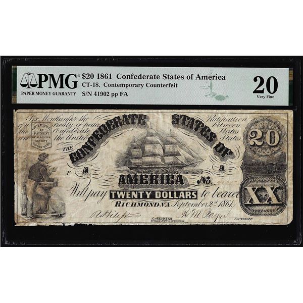 1861 $20 Confederate States of America Contemporary Counterfeit Note CT-18 PMG VF20221 - 1861 $20 Confederate States of America Contemporary Counterfeit Note CT-18 PMG VF20