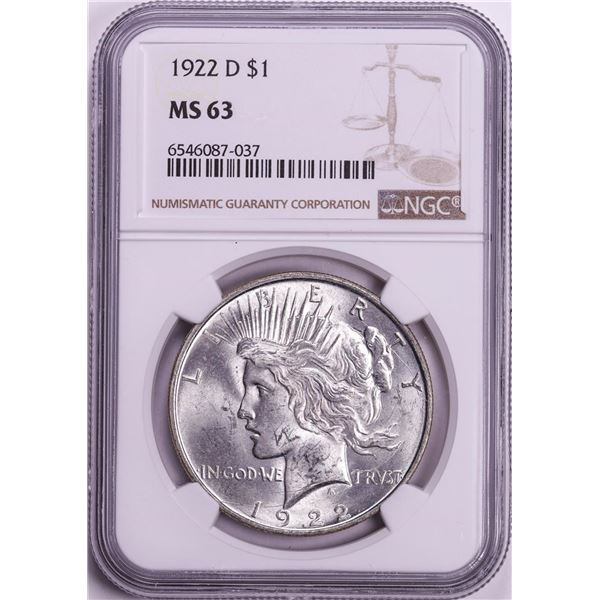 One 1922-D $1 Peace Silver Dollar Coin NGC MS63. NGC Certified.