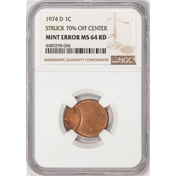 1974-D Lincoln Memorial Cent Coin Mint Error Struck 70% Off Center NGC MS64RD27 - 1974-D Lincoln Memorial Cent Coin Mint Error Struck 70% Off Center NGC MS64RD