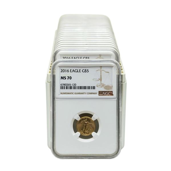 One Lot of (20) 2016 $5 American Gold Eagle Coins NGC MS70. NGC Certified.