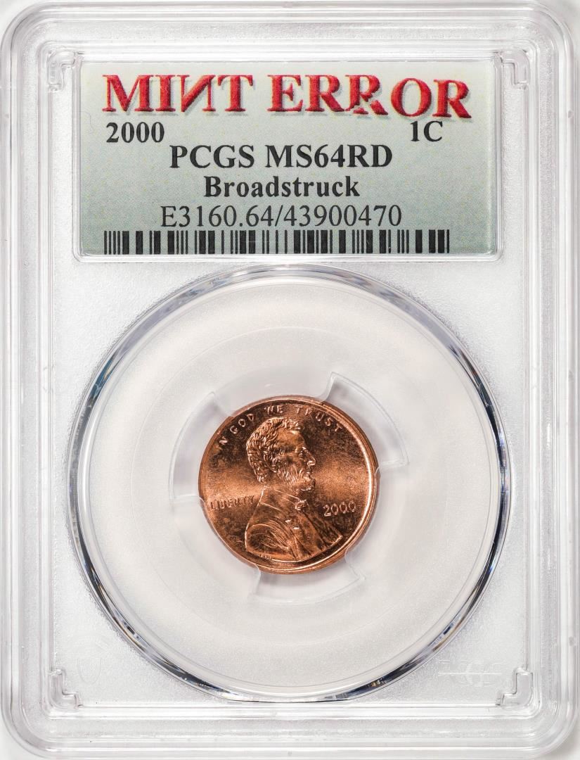 One 2000 Lincoln Memorial Cent Coin Mint Error Broadstruck PCGS MS64RD. PCGS Graded.