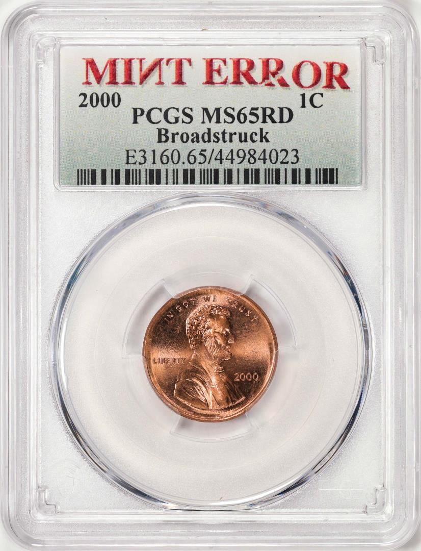 One 2000 Lincoln Memorial Cent Coin Mint Error Broadstruck PCGS MS65RD. PCGS Graded.