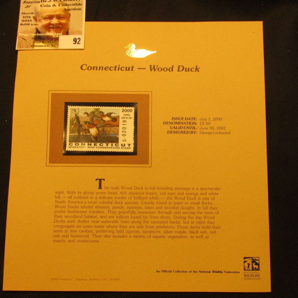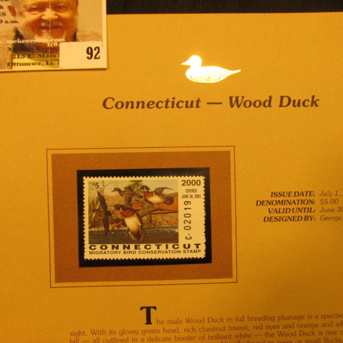 2000 Millennium Connecticut $5.00 State Migratory Waterfowl Stamp, mounted in a plastic page with literature in superb mint, unused condition. Depicts a flock of Wood Ducks.