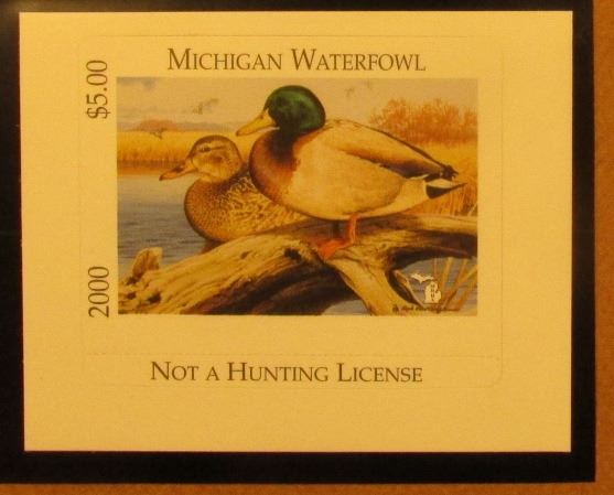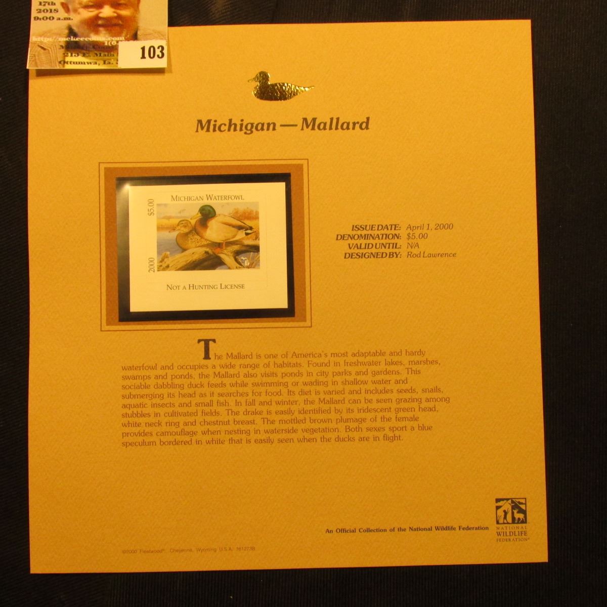 2000 Millennium Michigan $5.00 State Migratory Waterfowl Stamp, mounted in a plastic page with literature in superb mint, unused condition. Depicts a pair of Mallard Ducks.