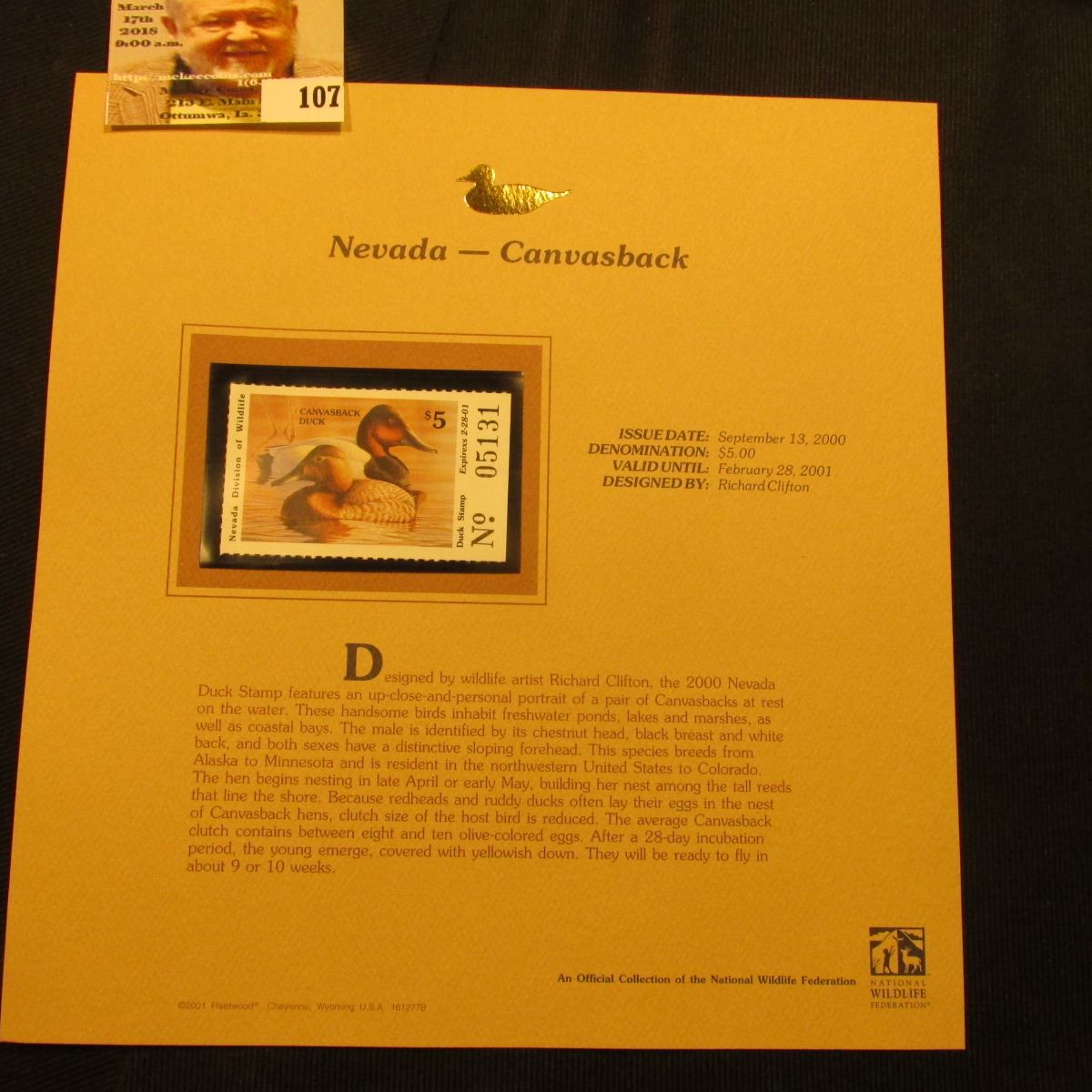2000 Millenium Nevada $5.00 State Migratory Waterfowl Stamp, mounted in a plastic page with literatu