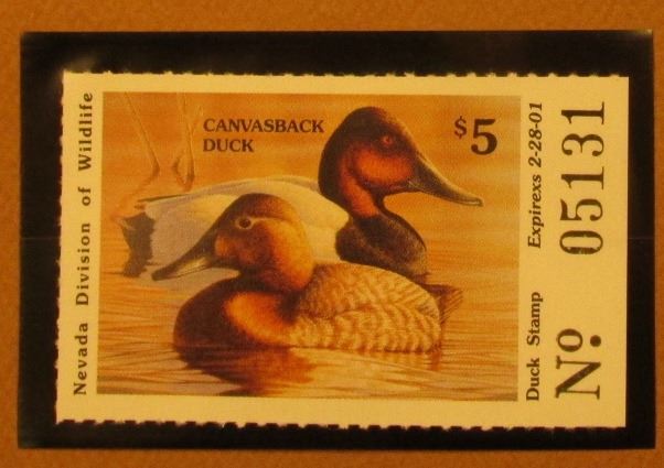 2000 Millennium Nevada $5.00 State Migratory Waterfowl Stamp, mounted in a plastic page with literature in superb mint, unused condition. Depicts a pair of Canvasback Ducks.