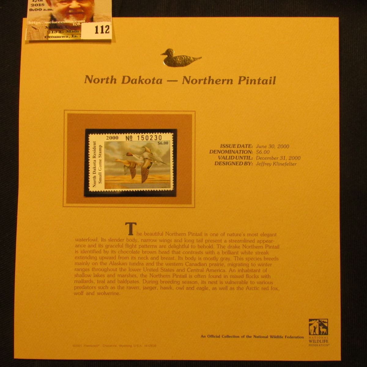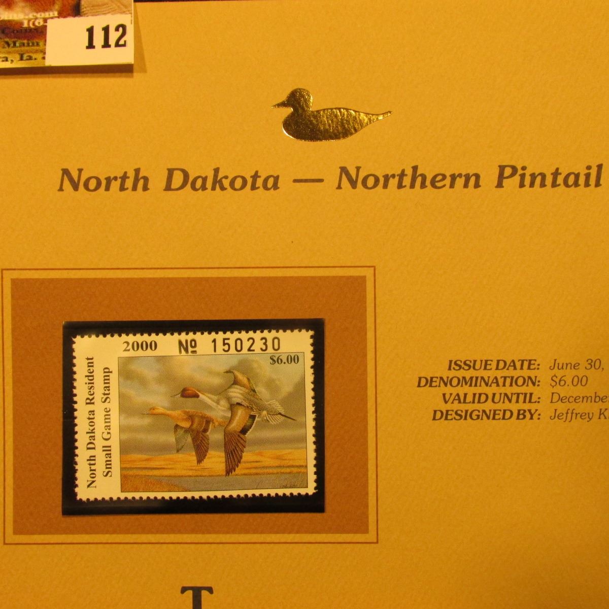 2000 Millennium North Dakota $6.00 State Migratory Waterfowl Stamp, mounted in a plastic page with literature in superb mint, unused condition. Depicts a pair of Northern Pintail Ducks.