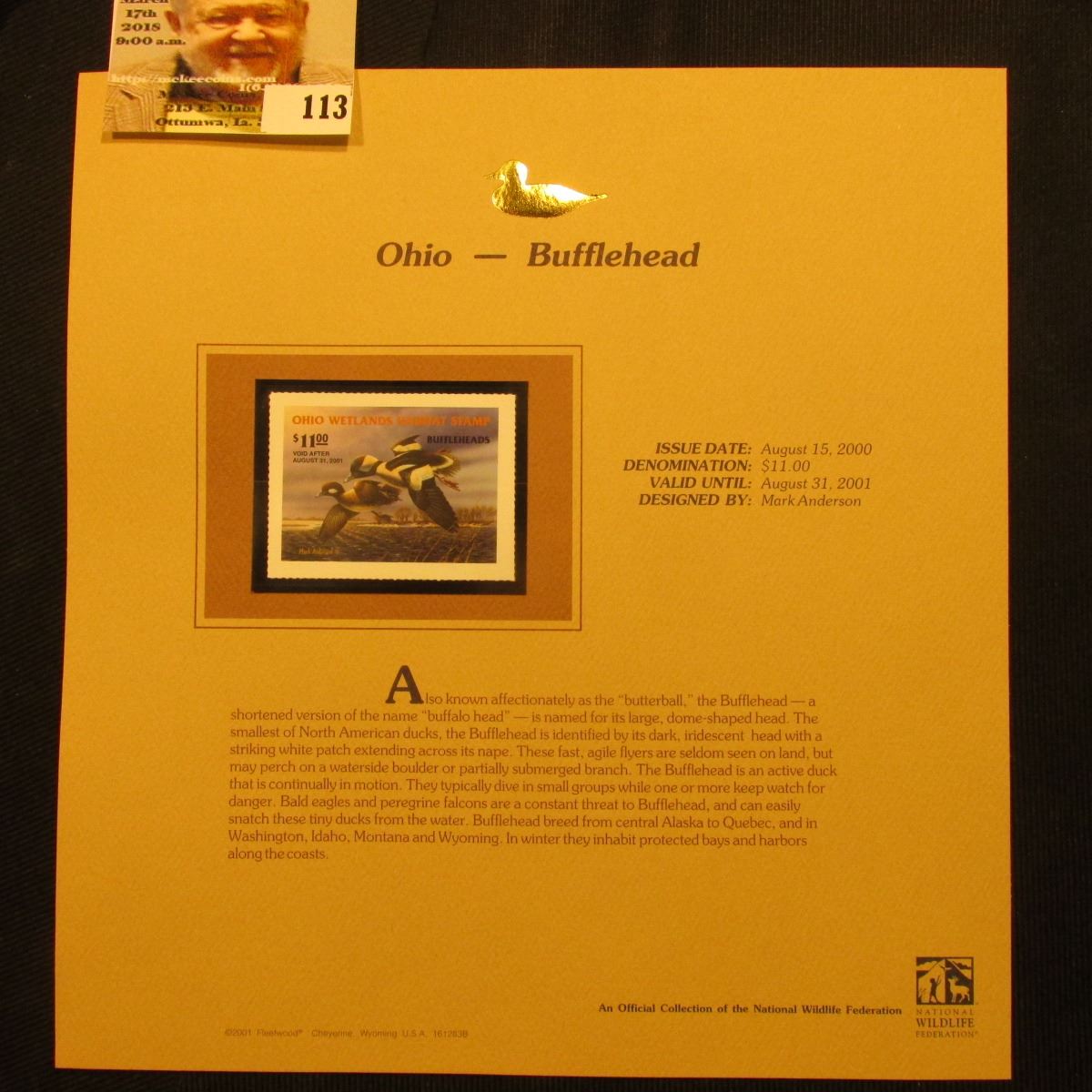 2000 Millennium Ohio $11.00 State Migratory Waterfowl Stamp, mounted in a plastic page with literature in superb mint, unused condition. Depicts a pair of Bufflehead Ducks.