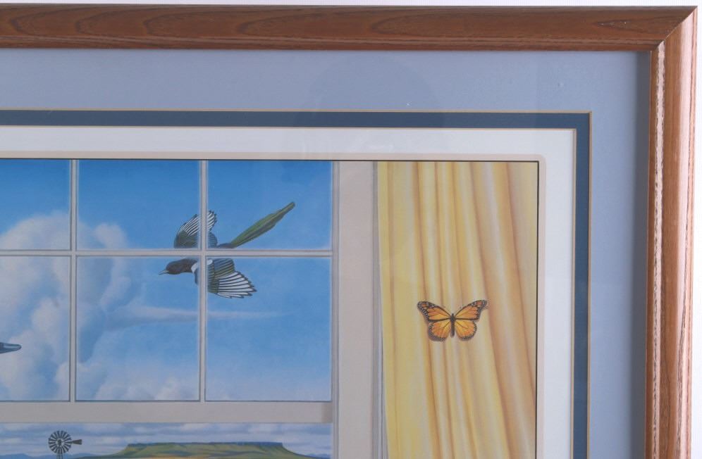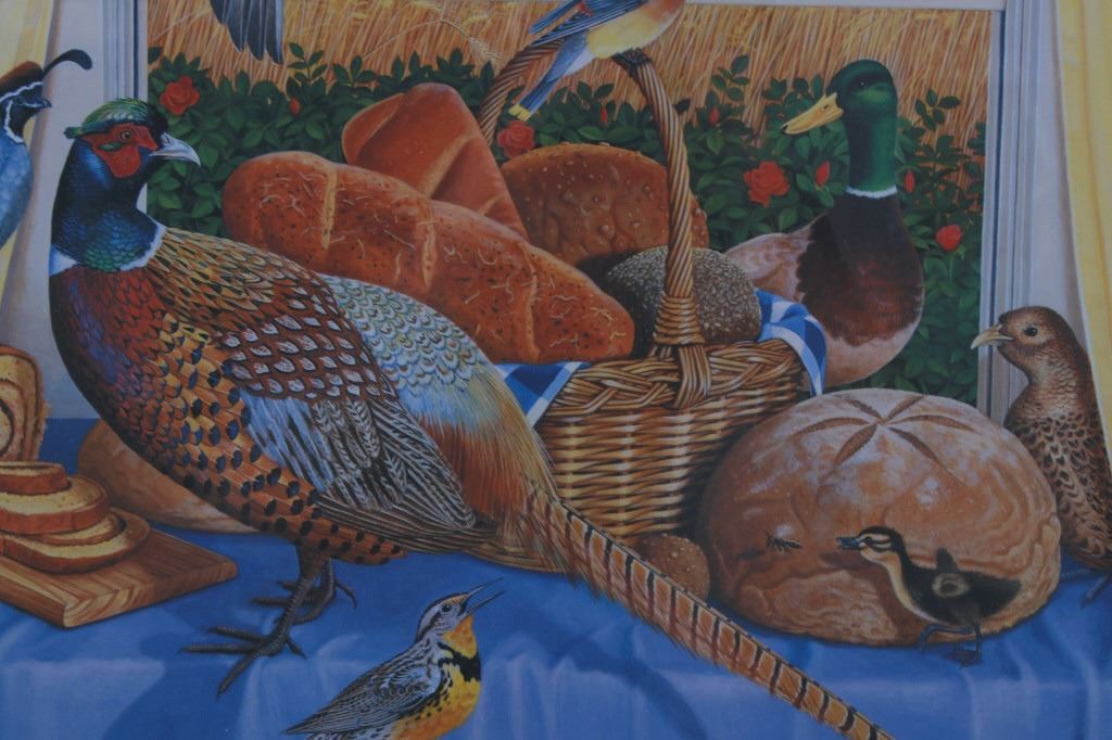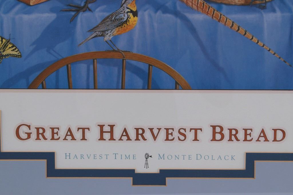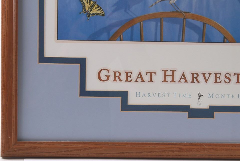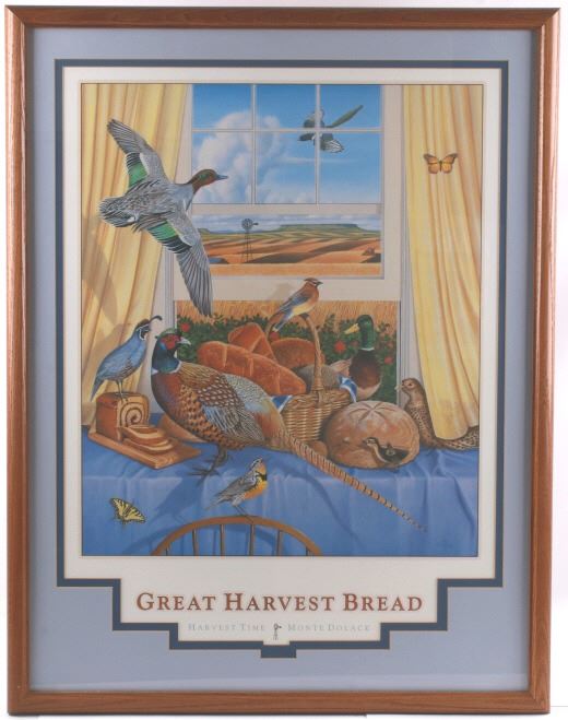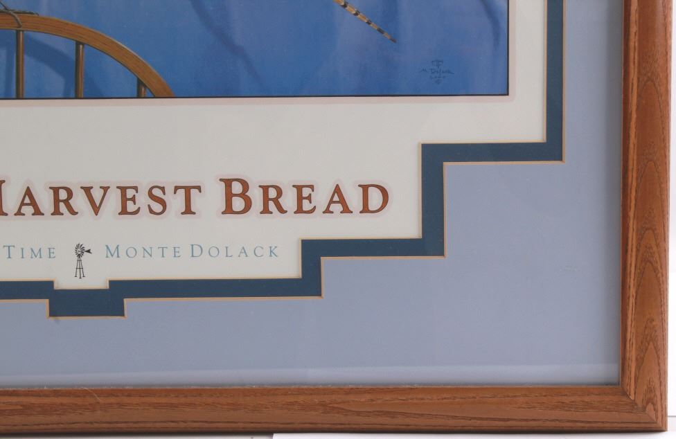 Featured in this lot is this Harvest Time theme, Monte Dolack lithograph called "Great Harvest Bread," circa 2000. The lithograph shows a harvest theme with a basket of bread, a pheasant, quail, and other birds present with a scene of wheat growing outside the window. The artwork shows the artist’s signature in the bottom right-hand corner with a date of 2000. A native and lifelong resident of Montana, Monte Dolack grew up surrounded by the same sweeping vistas and big sky as artist Charlie Russell. Monte’s love for the diverse landscapes and wildlife of the west are evident in the images he creates and the commissions he undertakes. The condition of this framed lithograph is good, with no obvious signs of damage.