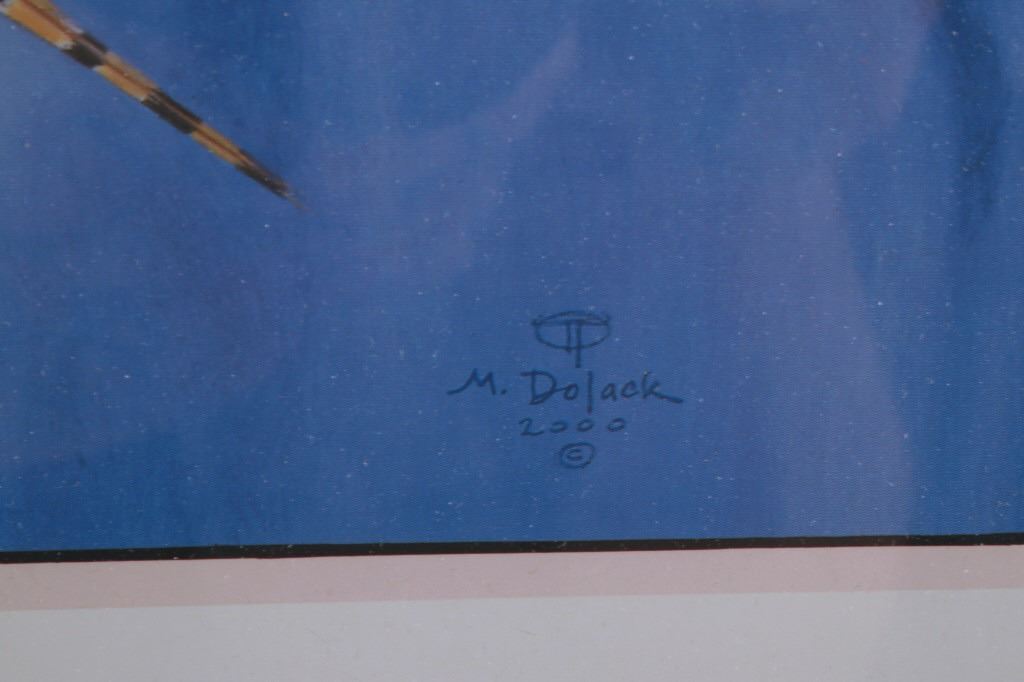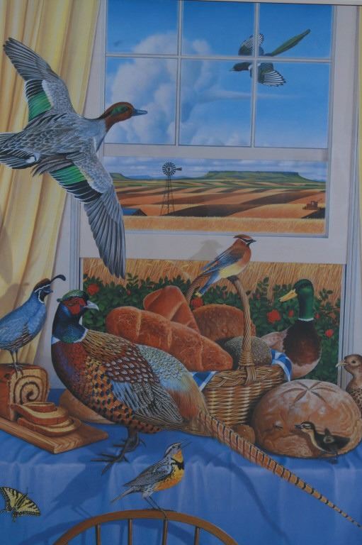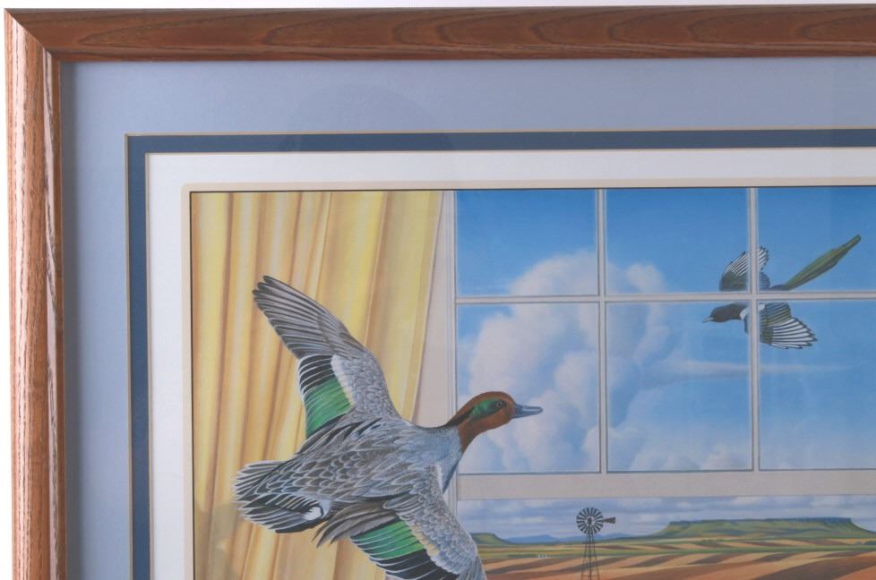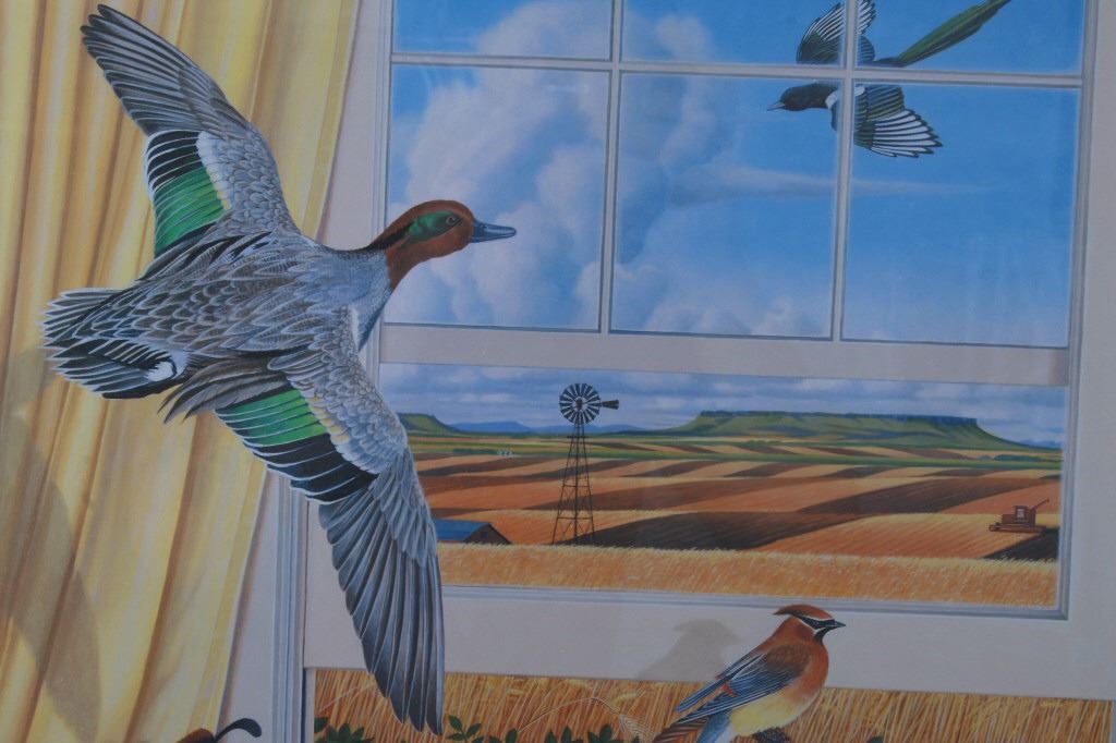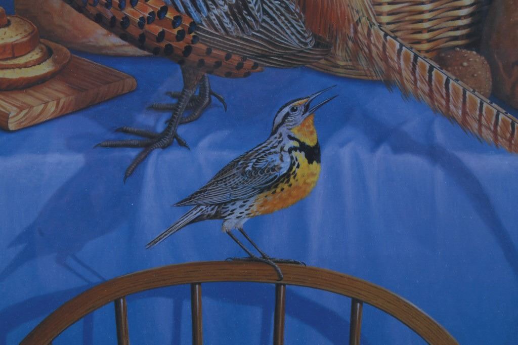 Featured in this lot is this Harvest Time theme, Monte Dolack lithograph called "Great Harvest Bread," circa 2000. The lithograph shows a harvest theme with a basket of bread, a pheasant, quail, and other birds present with a scene of wheat growing outside the window. The artwork shows the artist’s signature in the bottom right-hand corner with a date of 2000. A native and lifelong resident of Montana, Monte Dolack grew up surrounded by the same sweeping vistas and big sky as artist Charlie Russell. Monte’s love for the diverse landscapes and wildlife of the west are evident in the images he creates and the commissions he undertakes. The condition of this framed lithograph is good, with no obvious signs of damage.