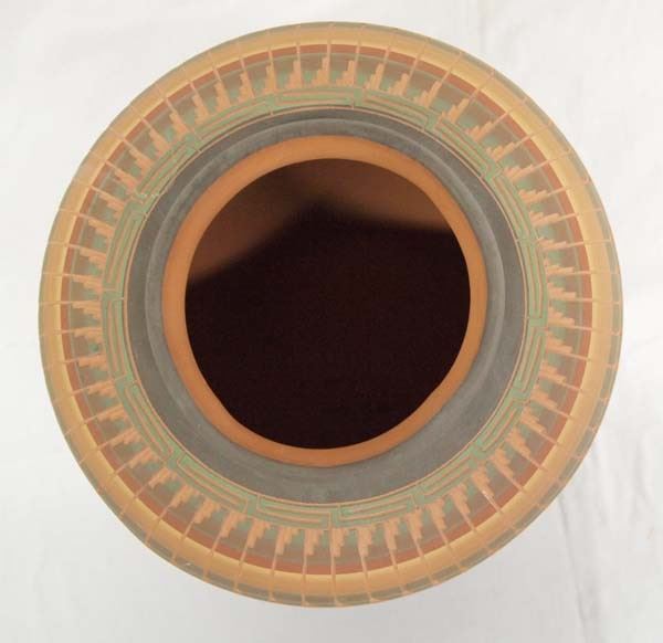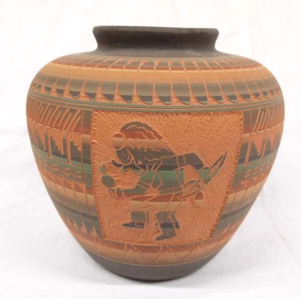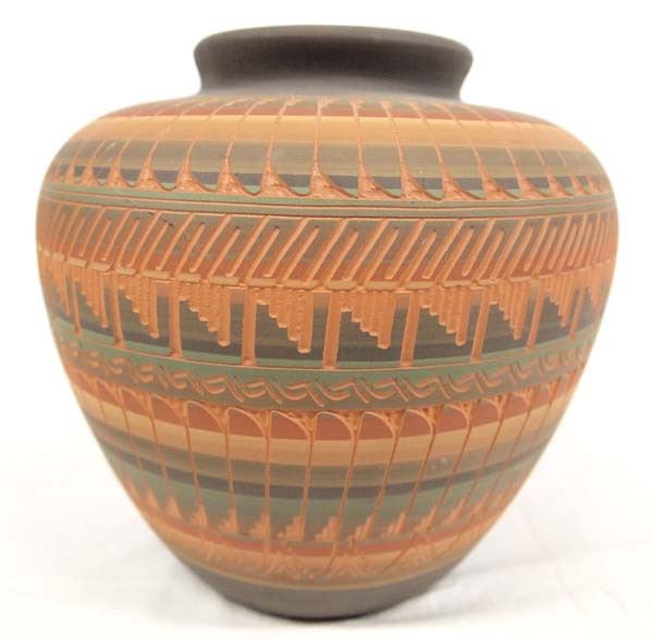 From the Whittredge Estate, we have a 2000 Native American Navajo Carved Pottery Jar by Dennison Billy, signed by artist and measures 9''H x 9''D, beautifully carved and painted
