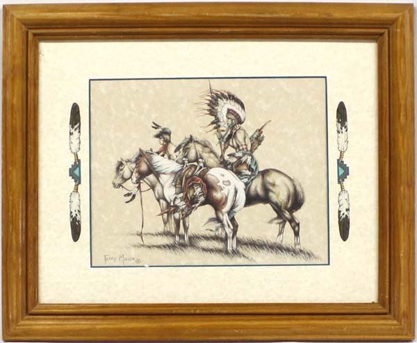 2000 Original Painiting by Terry Miller, framed, matted and under glass, Native American subject matter, artist's card taped to the back which reads ''Western Artist, Specializing in Equine Art, Pencil, Acrylic, & Oil...Lordsburg, NM'', visual measures 7.5 x 9.5'', well executed
