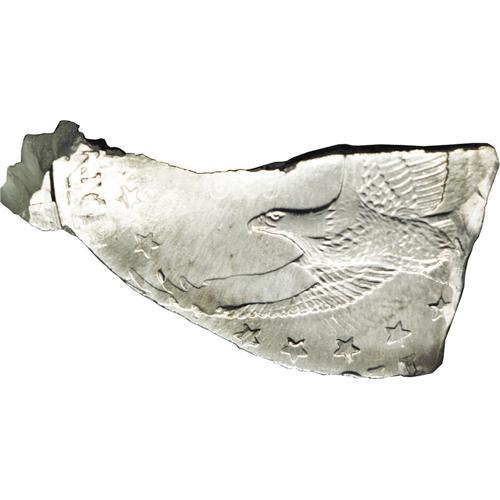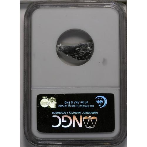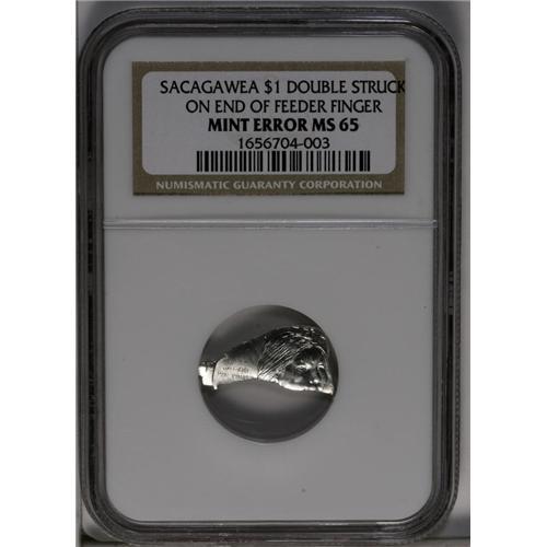 <B>2000-P<$1> Sacagawea Dollar--Double Struck on End of Feeder Finger--MS65 NGC.</B></I> Struck on a Delaware-shaped scrap of white metal from a mangled feeder finger. Sacagawea's serene gaze occupies the right obverse, and most of the motto IN GOD WE TRUST is also present. The reverse has the eagle's body and portions of both wings. Double struck, with evidence of a earlier strike above Sacagawea's head and beneath the eagle's lower wing. UNUM is present only a ghostly impression from the initial strike.