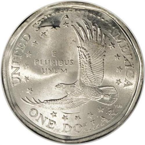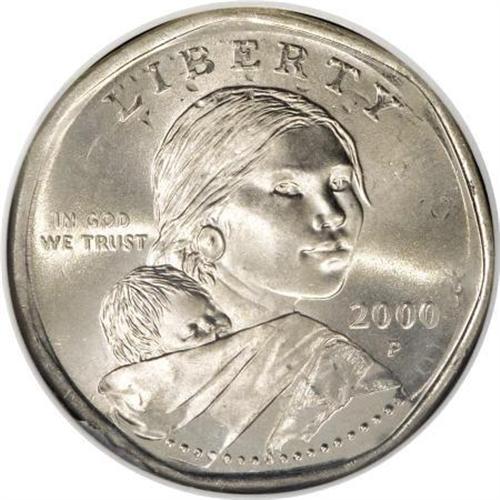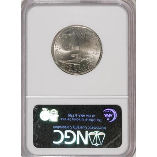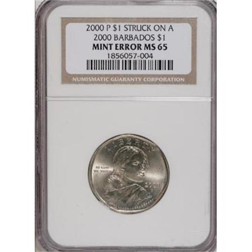 <B>2000-P $1 Sacagawea Dollar--Struck on a 2000 Barbados Dollar--MS65 NGC.</B></I> This Sacagawea dollar was struck on a KM-14.2 Barbados dollar. The upper outline of the flying fish undertype is present above the eagle. On the obverse, the DOS in BARBADOS is faintly visible near the motto IN GOD WE TRUST. The first 2 and final 0 in the undertype date are legible at 2:30 and 7:30. Presumably, the Canadian Mint, which supplied some of the Sacagawea planchets, also struck coins for Barbados, and in the present case the deliveries were missed. Sacagawea errors are desirable, since the series was struck for circulation only in 2000 and 2001.<BR><BR><B>Coin Engraver:</B> Glenna Goodacre<BR><BR><b>Shipping:</b> Coins & Currency (<a target="_blank" href="http://www.heritageauctions.com/common/shipping.php">view shipping information</a>)