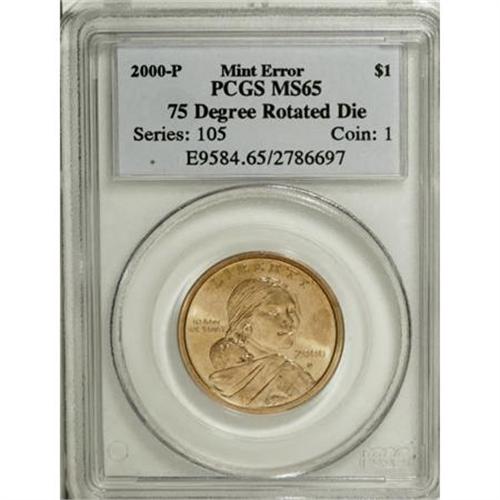 <B>2000-P $1 Sacagawea Dollar--75 Degrees Rotated Die--MS65 PCGS.</B></I><BR><BR><B>Coin Engraver:</B> Glenna Goodacre<BR><BR><b>Shipping:</b> Coins & Currency (<a target="_blank" href="http://www.heritageauctions.com/common/shipping.php">view shipping information</a>)