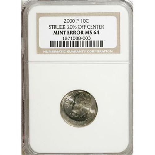 <B>2000-P 10C Roosevelt Dime--Struck 20% Off Center--MS64 NGC.</B></I> <BR><BR><B>Coin Engraver:</B> John R. Sinnock<BR><BR><b>Shipping:</b> Coins & Currency (<a target="_blank" href="http://www.heritageauctions.com/common/shipping.php">view shipping information</a>)