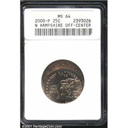 2000-P 25C New Hampshire Quarter--Off Center--MS64 ANACS.<p>Struck 25% off-center to the 12 o'clock obverse position. A smattering of opaque white color is noted overall. Important notice: We expect to be auctioning lots at the rate of 200-250 per hour. Sometimes eBay Premier live bid software cannot keep up with that pace, so we strongly recommend that you place a realistic proxy bid now as insurance to avoid disappointment. Also please note that all Heritage/CAA lots purchased through eBay Premier carry a 20% Buyer's Premium.