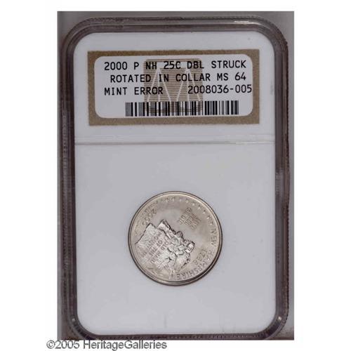 <B>2000-P<25C> New Hampshire Statehood Quarter--Double Struck, Rotated in Collar--MS64 NGC.</B></I> Lustrous, lightly toned, and carefully preserved. More importantly, both sides exhibit strong evidence of a double strike, most apparent near the legends, with the piece rotating about 5 degrees counterclockwise between strikes relative to the statehood side.