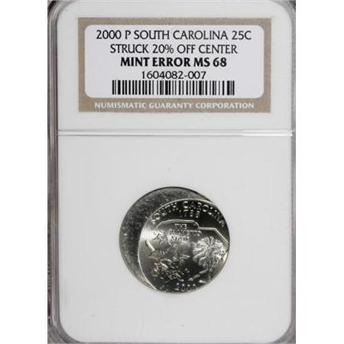 <B>2000-P 25C South Carolina Quarter--20% Off Center--MS68 NGC.</B></I> Struck 20% off-center at 1 o'clock based on the obverse design, or off-center at 4 o'clock based on the reverse design. Every detail is bold and the surfaces (of the struck portion) are immaculate.<BR><BR><b>Shipping:</b> Coins & Currency (<a target="_blank" href="http://www.heritageauctions.com/common/shipping.php">view shipping information</a>)