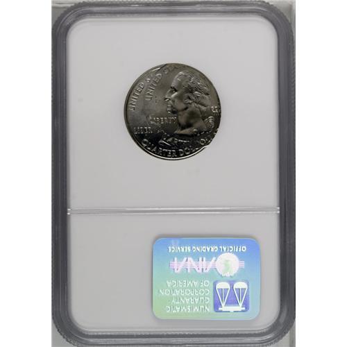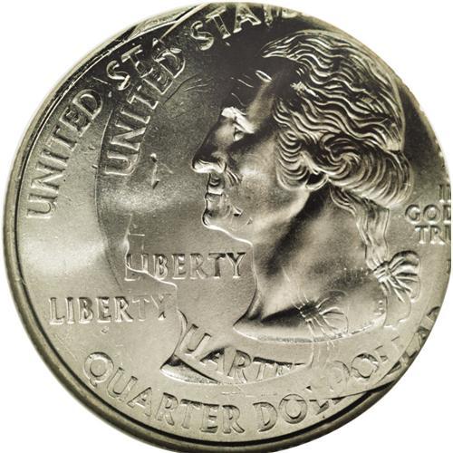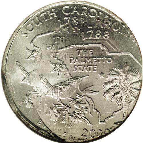 <B>2000-P<25C> South Carolina Statehood Quarter--Double Struck--MS66 NGC.</B></I> The initial strike was normal, but the piece did not eject from the dies and received a second strike, 20% off center toward 4 o'clock relative to the statehood side. The mintmark from the first strike is visible on Washington's shoulder from the second strike. Lightly toned and fully lustrous.