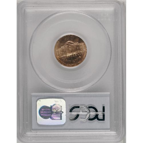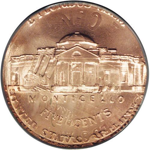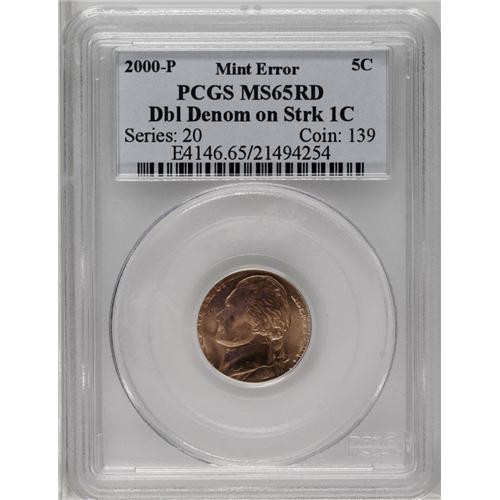<B>2000-P<5C> Jefferson Nickel--Struck on a Struck Cent--MS65 PCGS.</B></I> Mr. Jefferson and Mr. Lincoln are both portrayed on the obverse of this six-cent coin. The orientation is obverse on obverse with nearly 180 degrees rotation. The date from the Lincoln cent is visible at Jefferson's nose. A remarkable error with fully brilliant light orange coloration.