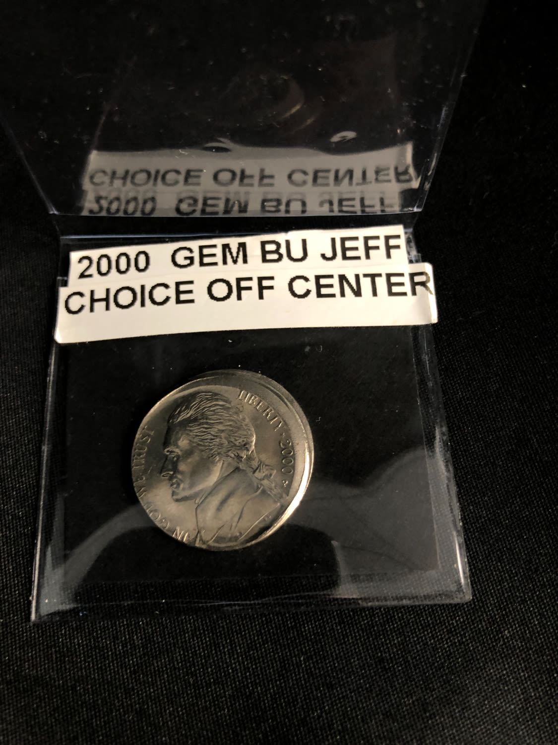 2000 P Off Center Error Jefferson Nickel in Choice BU. A Wonderful example of an off-center strike on this beautiful BU Nickel. Super Nice!