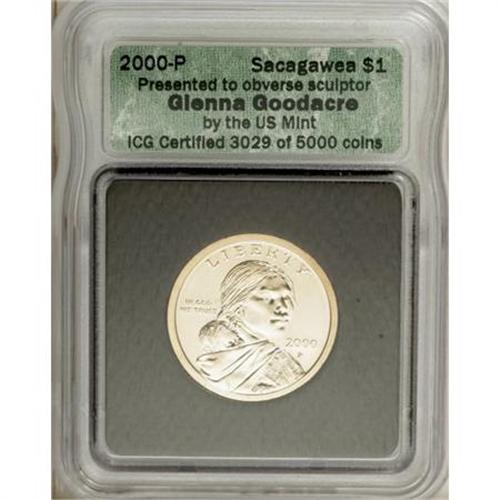 <B>2000-P $1 Goodacre Ungraded ICG.</B></I> Presented to obverse sculptor Glenna Goodacre by the U.S. Mint. ICG Certified #3029 of 5000 coins.<BR><BR><b>Shipping:</b> Coins & Currency (<a target="_blank" href="http://www.heritageauctions.com/common/shipping.php">view shipping information</a>)