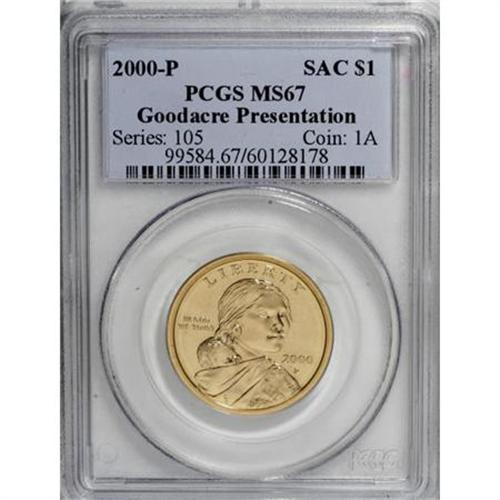 <B>2000-P SAC$1 Goodacre Presentation MS67 PCGS.</B></I> PCGS Population (226/431). NGC Census: (0/0). Numismedia Wsl. Price for NGC/PCGS coin in MS67: $31. (#99584)<BR><BR><b>Shipping:</b> Coins & Currency (<a target="_blank" href="http://www.heritageauctions.com/common/shipping.php">view shipping information</a>)