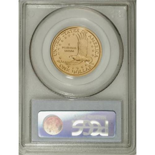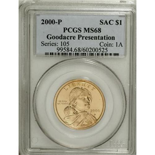 <B>2000-P SAC$1 Goodacre MS68 PCGS.</B></I> One of 5,000 pieces, dated 2000, presented to sculptor Glenna Goodacre in payment for the obverse design. The finish is prooflike with no cameo contrast. A virtually pristine example.<BR><BR><b>Shipping:</b> Coins & Currency (<a target="_blank" href="http://www.heritageauctions.com/common/shipping.php">view shipping information</a>)
