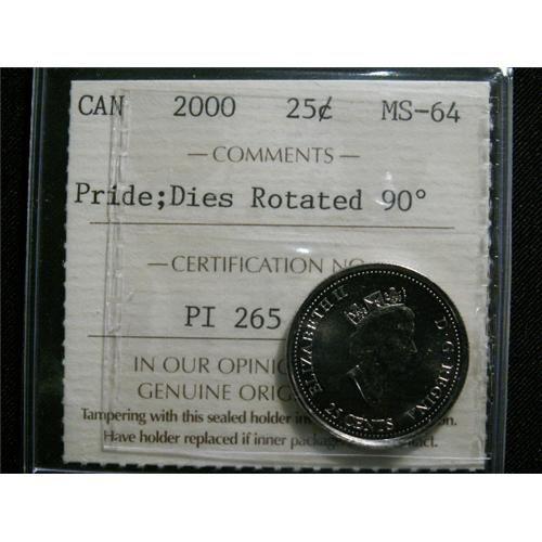 2000 Pride "Rotated dies 90 degr." 25¢ ICCS MS64. Brilliant with reflective surfaces. A popular error coin!