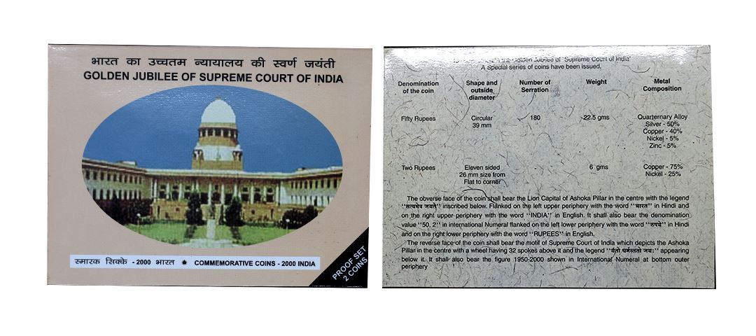 2000 Proof Set, Golden Jubilee of Supreme Court of India, set of 2, Rupees 2 and 50. In immaculate condition, within original packaging, Rare. (2); ( from the collection of Mr. I. K. Kejriwal ).