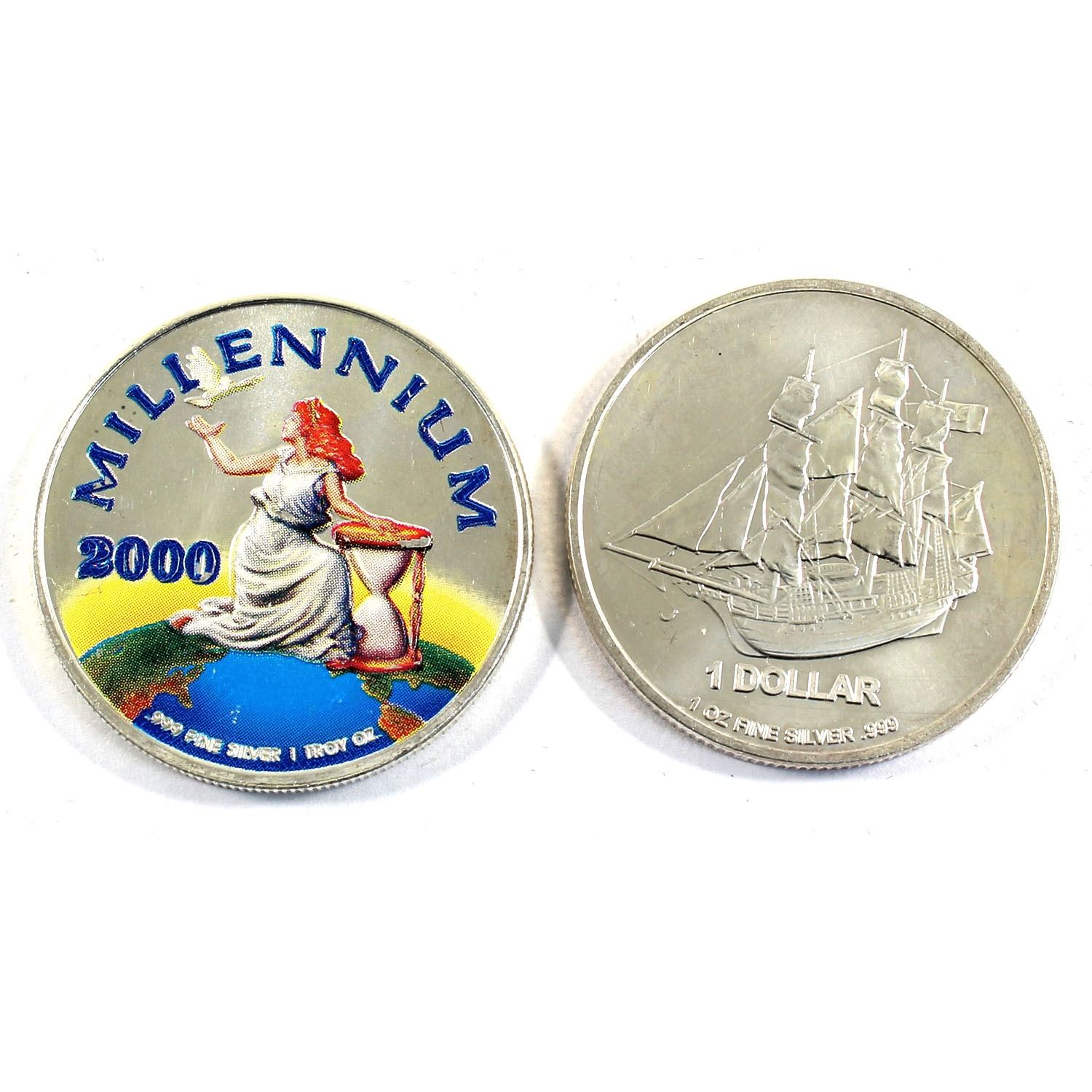 2000 Republic of Liberia Coloured Millennium & 2014 Cook Islands Ship 1oz .999 Fine Silver Rounds (toned). 2pcs (TAX Exempt)