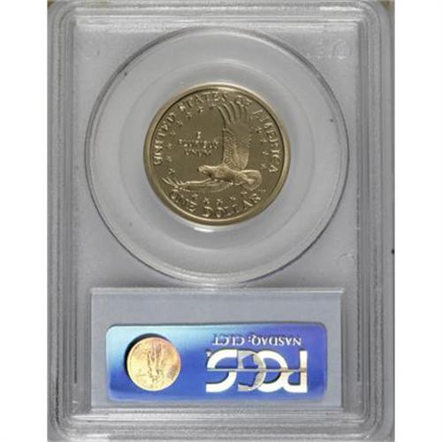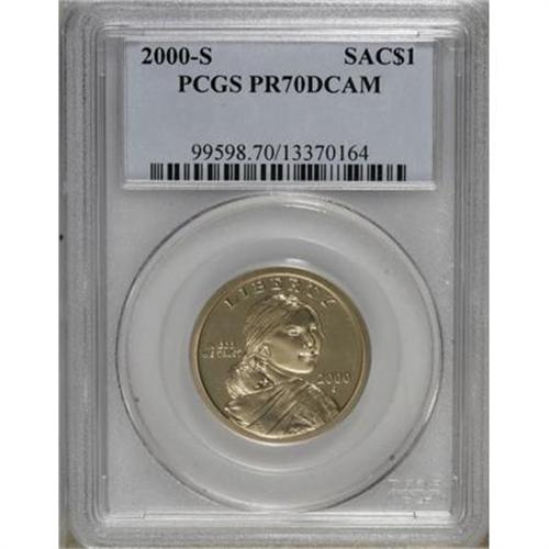<B>2000-S $1 Sacagawea PR70 Deep Cameo PCGS.</B></I> The Sacagawea dollars have not enjoyed great success in circulation, but collectors are finding them to be increasingly attractive. This immaculately preserved specimen is flawlessly struck and exhibits noteworthy cameo contrast on both sides. Although more than 4 million pieces were produced, a mere 72 examples have been graded as PR70 Deep Cameo by PCGS, as of (3/08). <BR><BR><b>Shipping:</b> Coins & Currency (<a target="_blank" href="http://www.heritageauctions.com/common/shipping.php">view shipping information</a>)